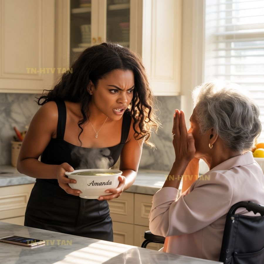 El chisporroteo del aceite llenó la lujosa cocina mientras Chisom removía una olla de sopa hirviendo con movimientos bruscos. Su vestido de diseñador estaba arrugado, su cabello despeinado tras horas cocinando con furia. Al otro lado de la cocina de mármol, la Sra. Margaret permanecía sentada, indefensa, en su silla de ruedas, con la mirada perdida y las frágiles manos temblando mientras buscaba a tientas algo a lo que agarrarse.
