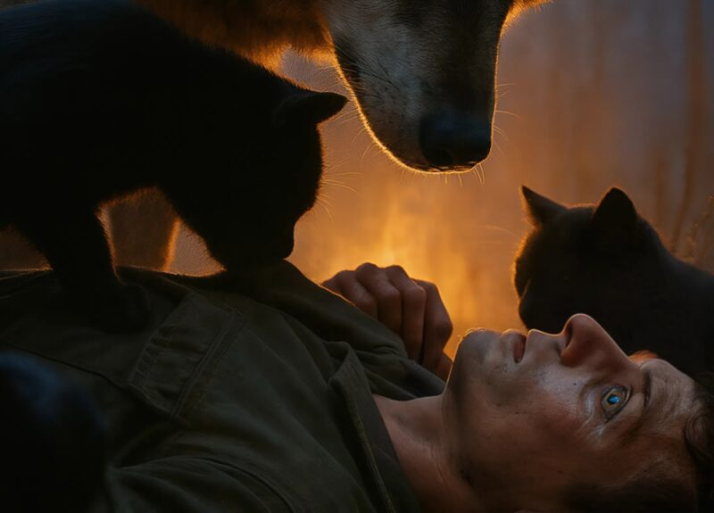 El hombre no podía creer lo que veía. Permaneció inmóvil mientras los animales parecían abrazarlo, presionando sus cálidos cuerpos contra el suyo. La loba yacía a su lado, respirando agitada pero tranquilamente, calentándolo con su cuerpo.