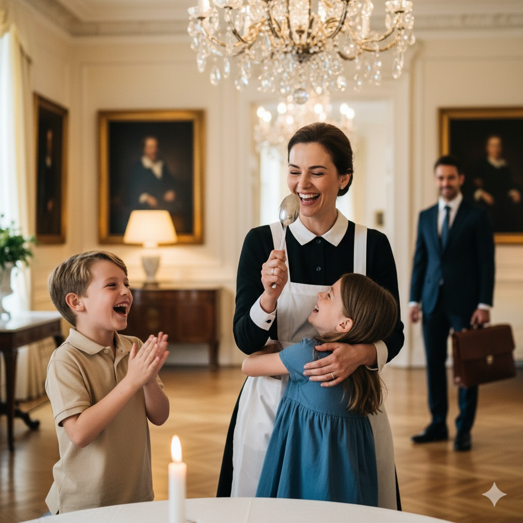 El tiempo pasó, y una noche Adrián contempló otra escena en el comedor. Ethan y Lily reían, enseñándole a Rosa un baile tonto que habían aprendido en la escuela. La lámpara de cristal bañaba la sala en una luz dorada, las risas resonaban, y el corazón de Adrián se desbordaba como nunca.